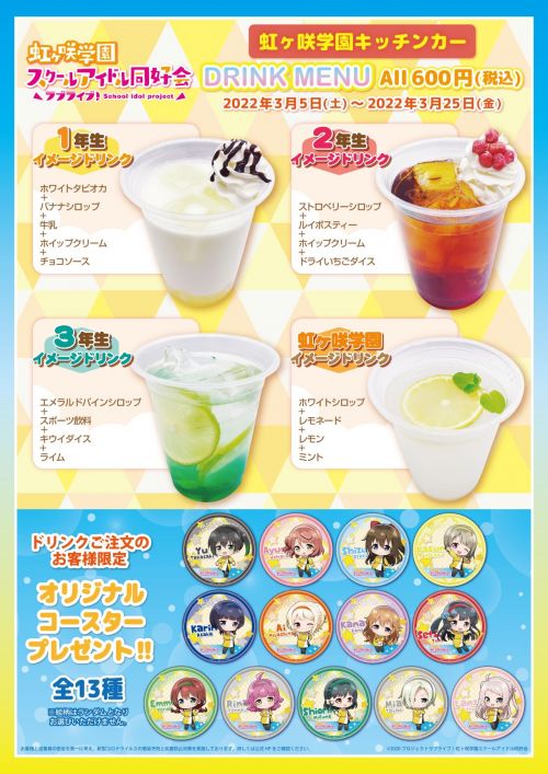 虹ヶ咲学園キッチンカーの限定ドリンクに新メニュー登場♪ここでしか手に入らない、有明ガーデンモールスタッフ制服姿のニジガクメンバーのオリジナルコースターをゲットしてね!